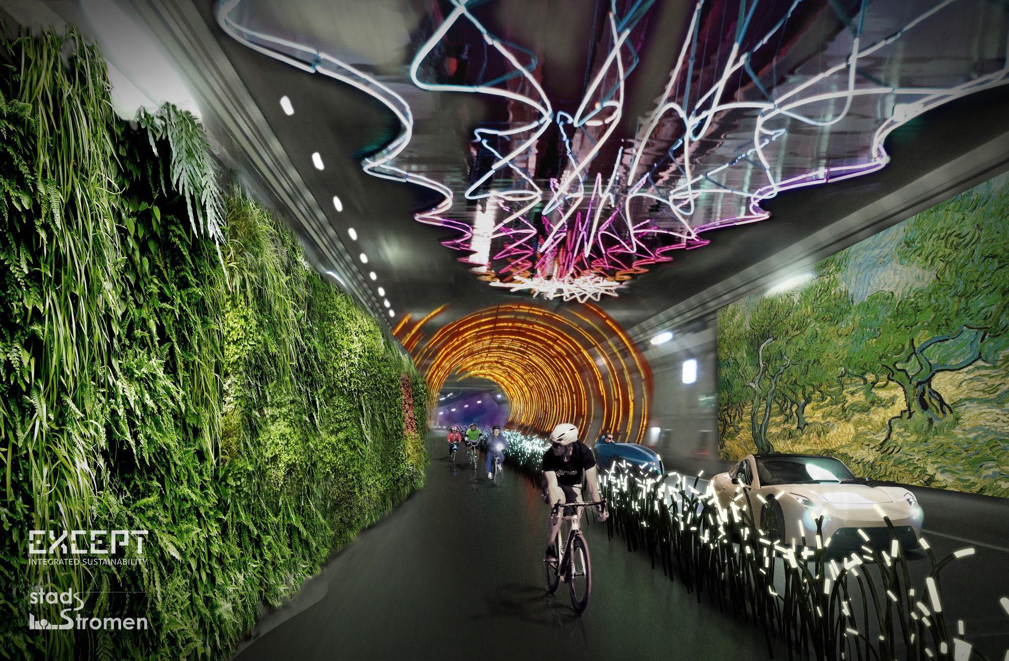 Together with Bart Stoffels of Stadsstromen, Except is investigating the opportunity of refitting the existing IJ tunnel. We´re excited about using this existing structure and making it into a tunnel everybody will love to cycle through. Can you imagine, cycling through a tunnel in which the walls are sometimes soft and alive, overgrown by cave plants that filter the air. Then, you go through an interactive section, in which the LED walls light up as you pass. Curious what´s going on in Amsterdam culturally? A part of the tunnel will be a display of all the fine art and music Amsterdam has to offer. Who would ever want to leave this magical place?