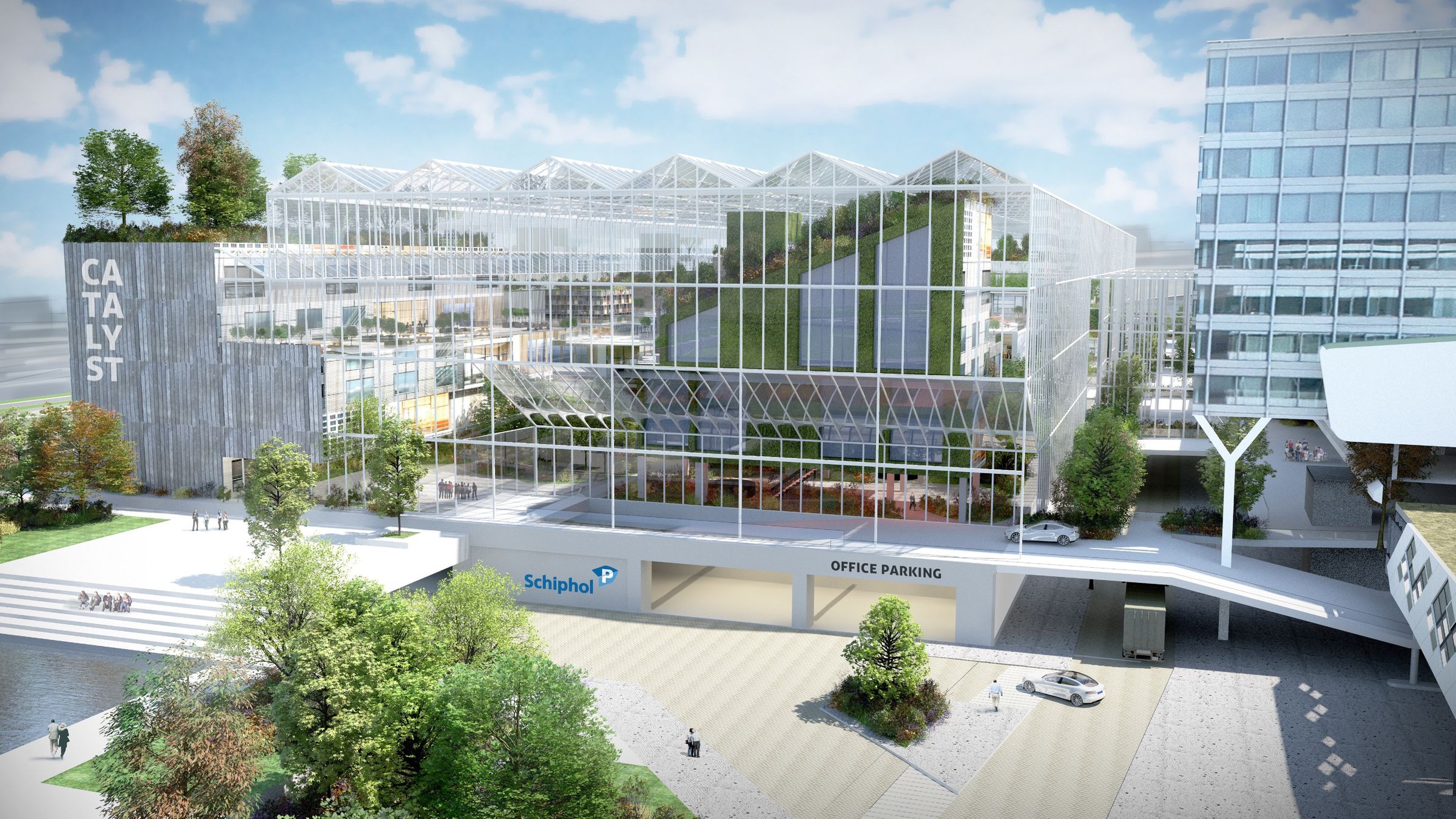 There are no realized examples of yet showcasing a building on such a ‘catalytic’ scale. However, the “Schiphol Catalyst” office concept, at Amsterdam’s Schiphol Airport, shows just how ambitious and impactful they can be. Designed by the team at Except Integrated Sustainability, the modular building allows users to alter and adjust work spaces, provides expansive internal ecosystems, and integrates local supply chains.