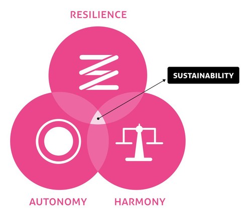 All other properties that a sustainable city needs fall within the domain of one of these three. For example, climate adaptation falls under resilience, circularity and good availability falls under autonomy, and equitable resource distribution under harmony.