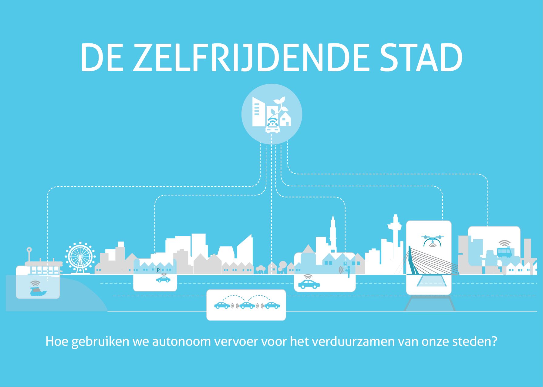 De volledig zelfrijdende auto waarin geen chauffeur meer nodig is heeft nog een lange weg te gaan. De rekenkracht van processoren, de beschikbaarheid van snel en betrouwbaar internet overal, juridische barrières zoals aansprakelijkheid bij ongevallen, het is allemaal nog niet opgelost. Toch ligt geautomatiseerd vervoer – een droom sinds de jaren ’50 van de vorige eeuw – nu echt binnen handbereik. Daarvoor is ons technisch vermogen hoog genoeg en – belangrijker dan dat – de kansen zijn eenvoudig weg te groot. Zelfrijdend vervoer biedt in potentie enorme voordelen: minder ongevallen, lager energieverbruik en effectiever gebruik van de beschikbare wegcapaciteit. Dat zijn grote maatschappelijke effecten als je bedenkt dat een stad als Rotterdam nog altijd een van de steden met de slechtste luchtkwaliteit in Europa is. Daarnaast daalt het aantal verkeersslachtoffers in Nederland niet langer en zijn vooral fietsers en voetgangers daar de dupe van. Wellicht kunnen we ons een volgende generatie miljardenprojecten in snelwegen besparen wanneer auto’s zelf treintjes gaan vormen. En als we toch nog in de file staan, hebben we tenminste de handen vrij om iets anders te doen. Zelfrijdend vervoer gaat de klassieke maatschappelijke tweedeling tussen automensen en OV-mensen slechten. Al dan niet gedeelde taxisystemen worden goedkoper terwijl de met technologie volgeladen privéauto in eerste instantie vooral duurder wordt. Bedrijven als Uber of startup ZOOX springen in deze markt. De traditionele grote automerken verplaatsen hun verdienmodel van autoverkoop langzamerhand naar exploitatie van een vloot.