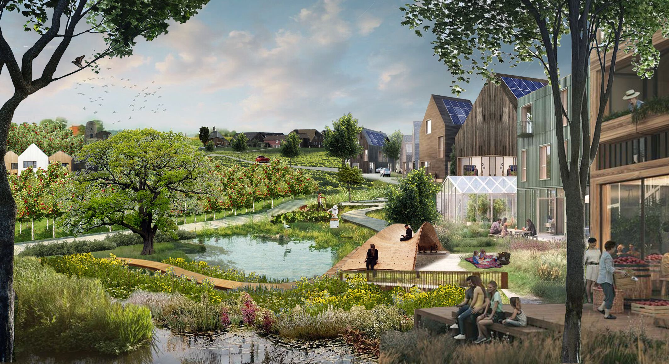 In the Sint Laurens masterplan, three housing clusters are interwoven across the landscape. The neighborhood opens up at two points on the Noordweg, a winding connecting road, beside which are community facilities and vegetable gardens. Housing is embedded amongst food production and waterways. The aforementioned biogas plant and greenhouses are located in the ecological zone where new aquatic habitats are created.