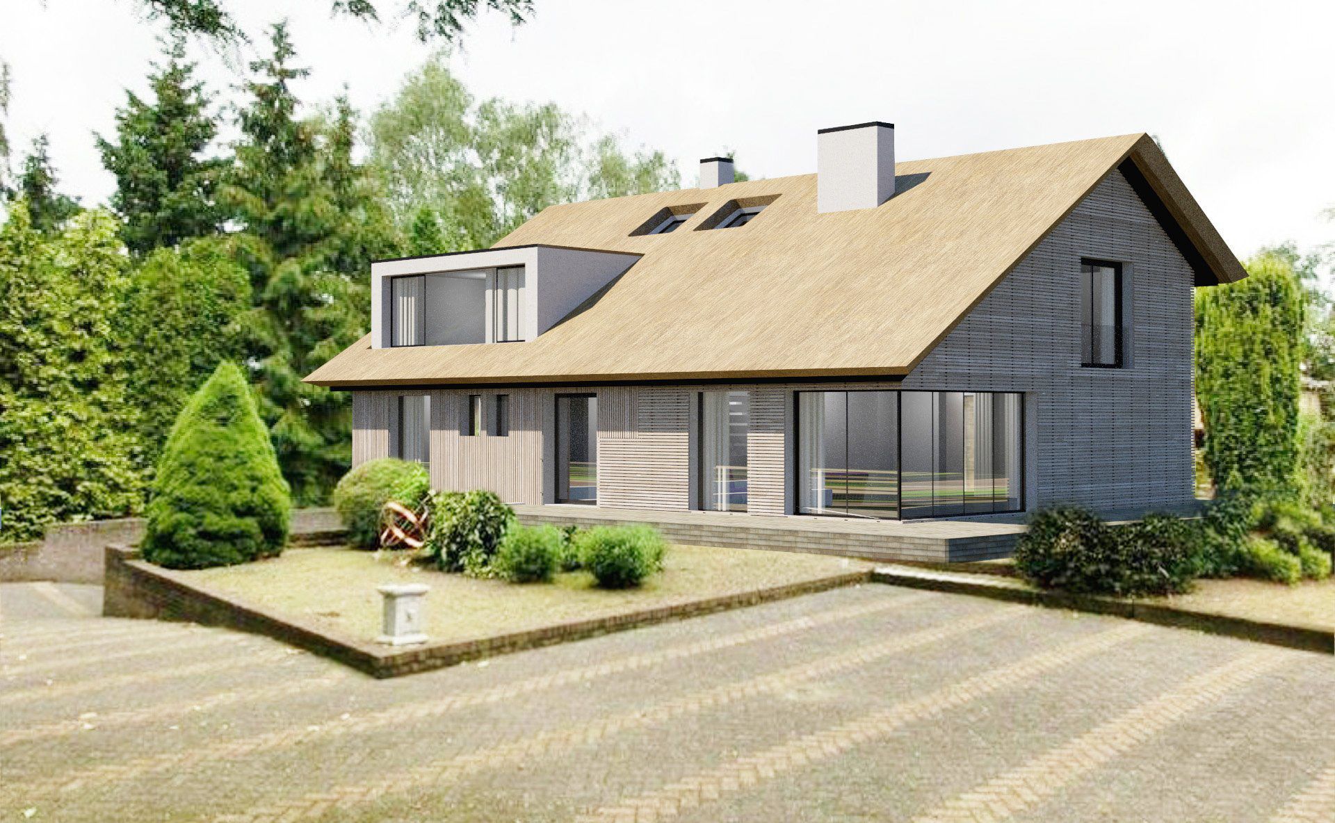 The renovation plan preserves the house's original structure and provides a larger space inside for a spacious and lofty living space with an open kitchen. The asymmetrical roof, a typical design feature of older homes, is preserved and the windows enlarged to allow more light and views to the gardens.