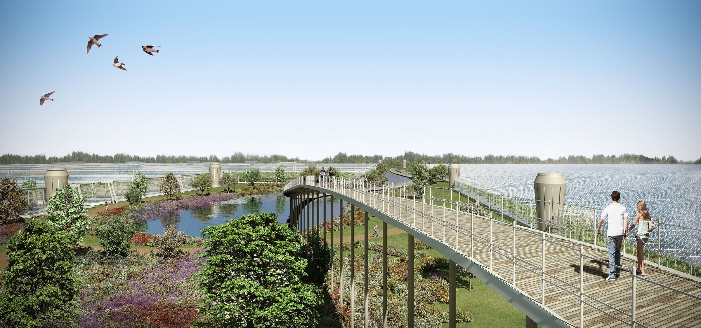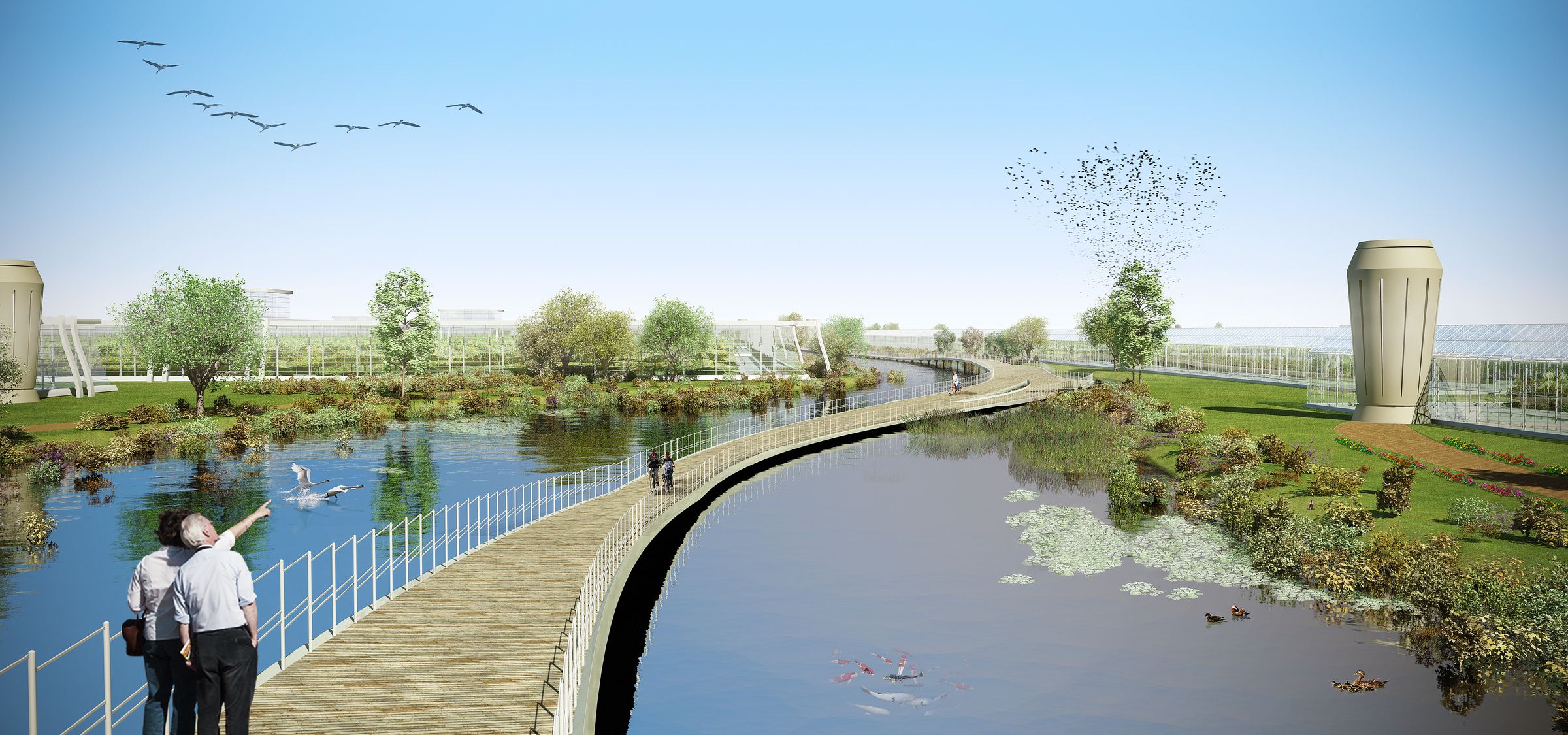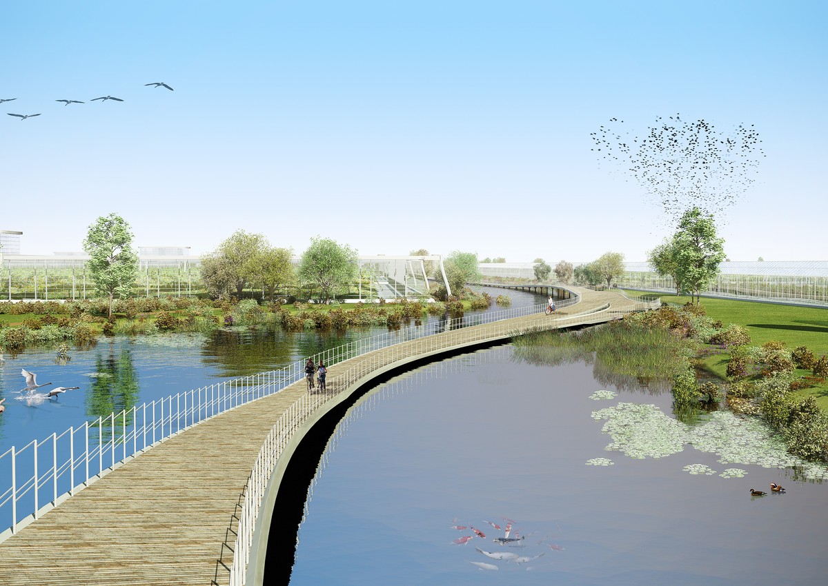 For the "Pearls in the Landscape" project, Except re-imagined the area as a combined ecological park, efficient greenhouse industry, and tourism destination. The project features innovations such as floating bicycle routes, a greenhouse visitor pavilion, algae water treatment facility, and integrated ecological systems. The exciting pathways allow logistics traffic for the greenhouses and visitors to the area to remain entirely separated while improving conditions for both.