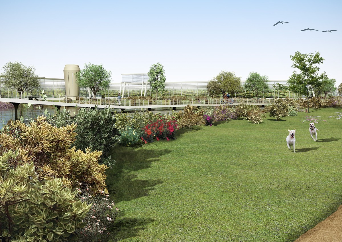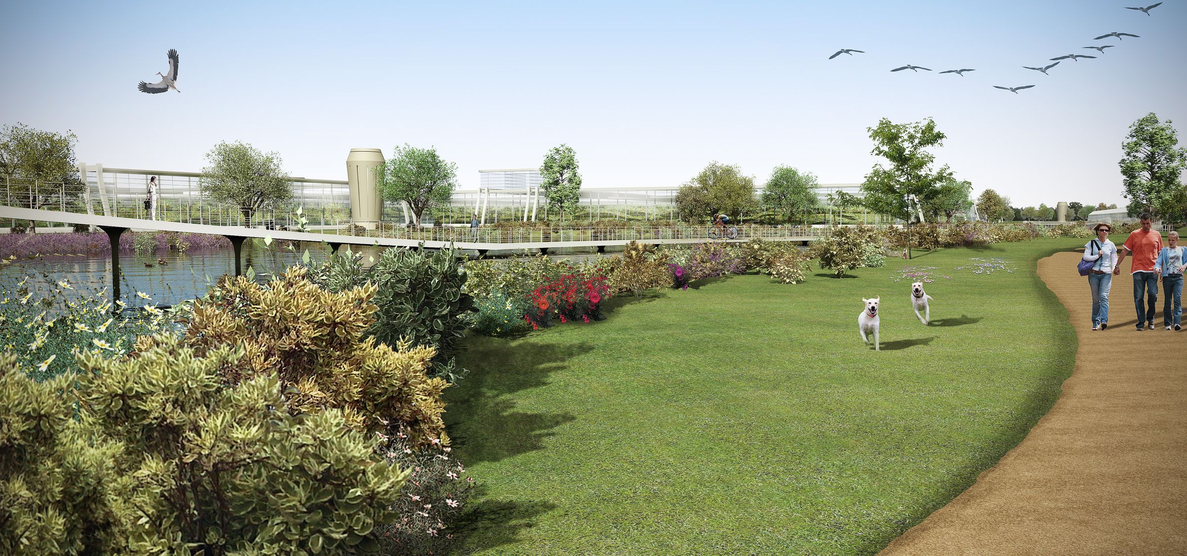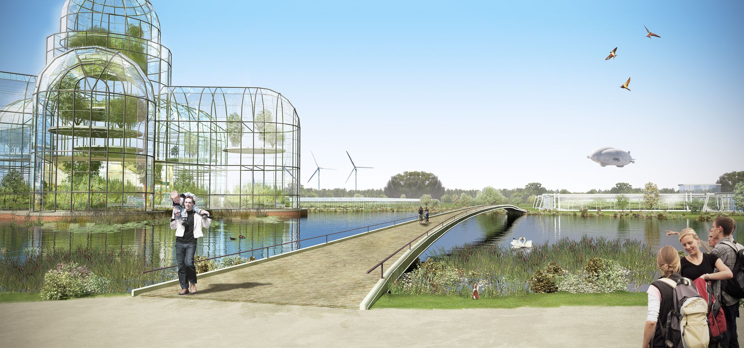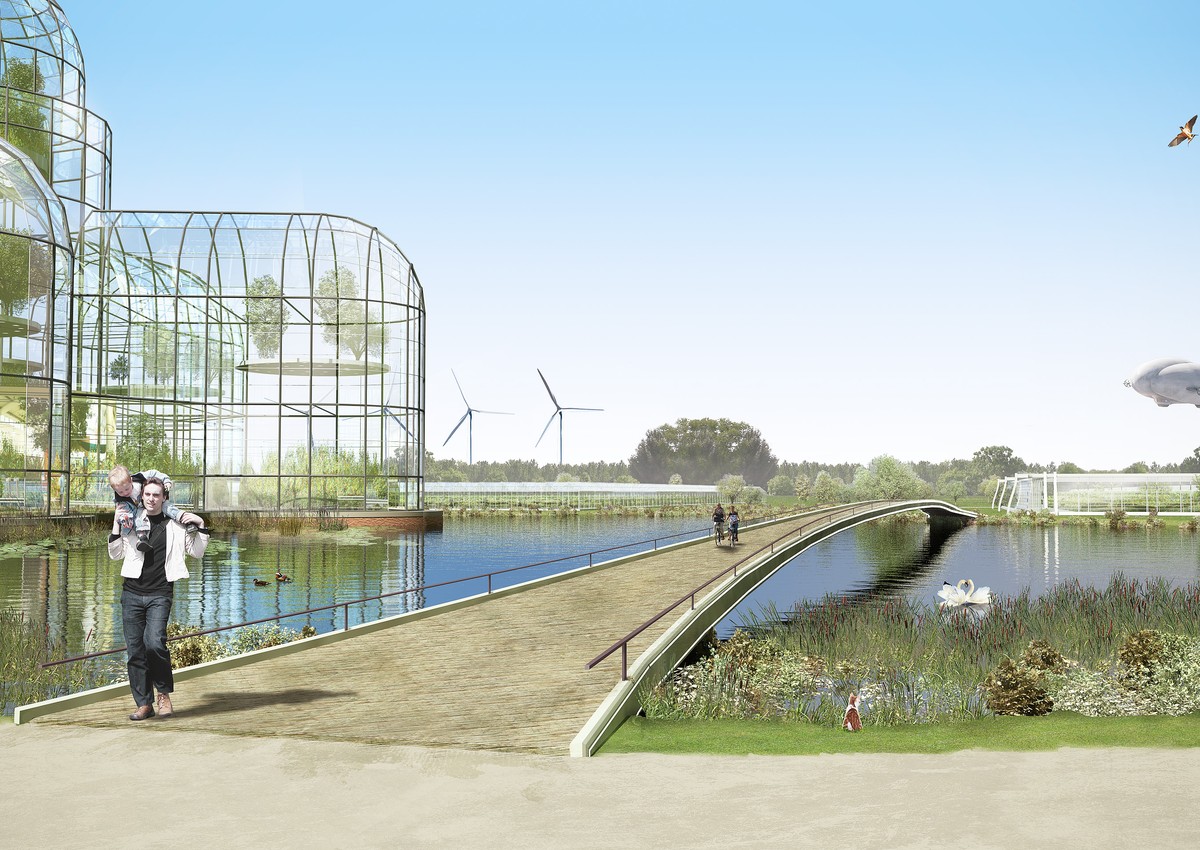 For the "Pearls in the Landscape" project, Except re-imagined the area as a combined ecological park, efficient greenhouse industry, and tourism destination. The project features innovations such as floating bicycle routes, a greenhouse visitor pavilion, algae water treatment facility, and integrated ecological systems. The exciting pathways allow logistics traffic for the greenhouses and visitors to the area to remain entirely separated while improving conditions for both.