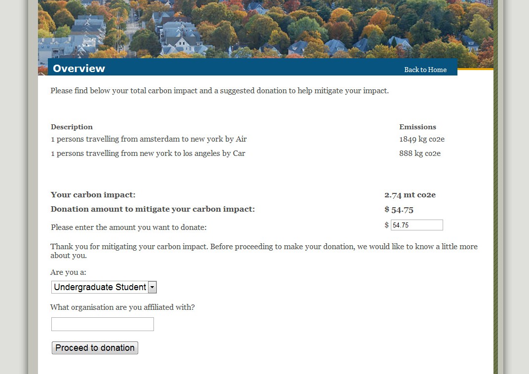 The calculator is an intuitive and easy-to-use website for assessing greenhouse gas emissions linked to Yale events and operations. The website helps enhance users' knowledge about climate change and its impacts and guides them to offset them by supporting energy efficiency investments in local low-income communities.
